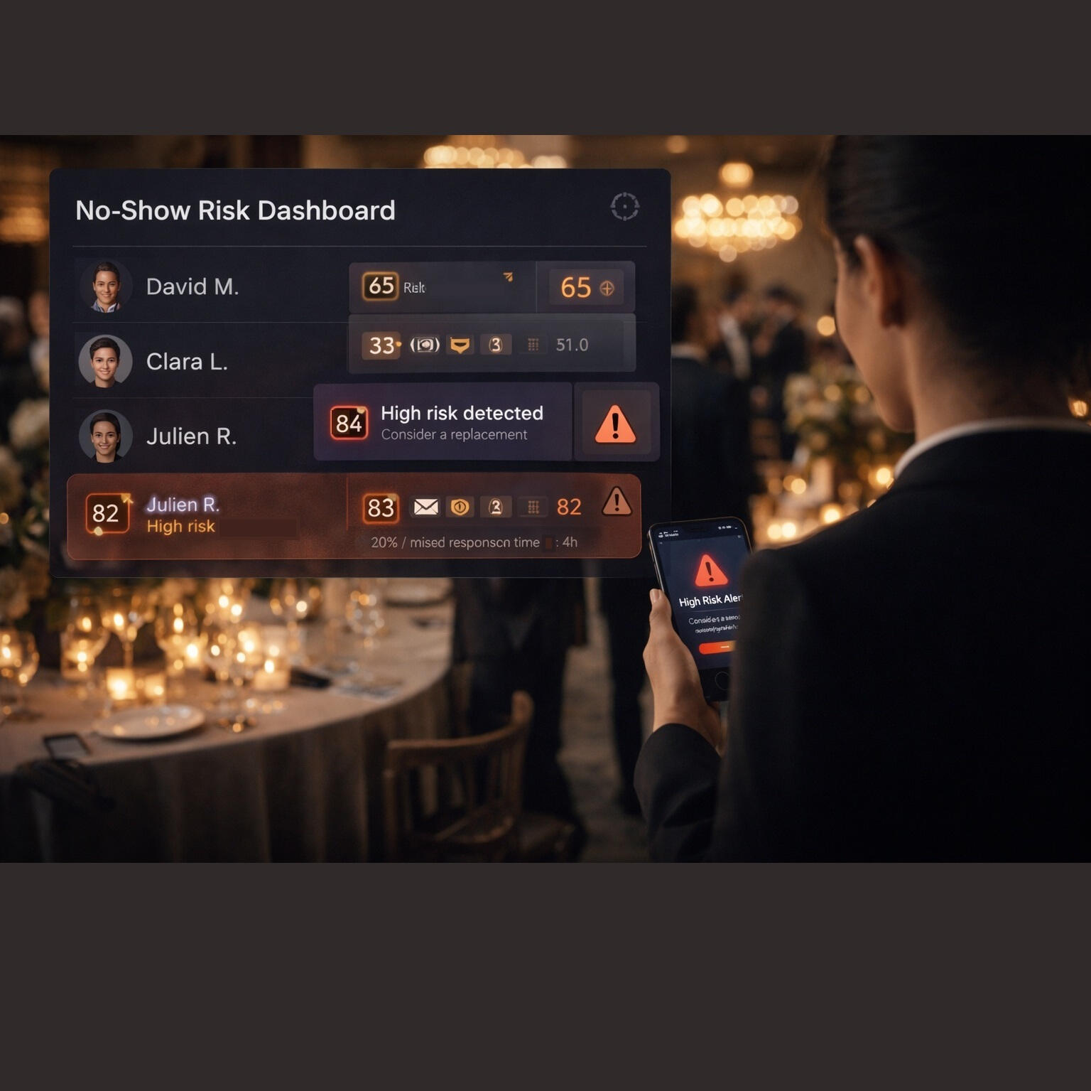 L’agent IA analyse l’historique de chaque membre du staff (no-shows passés, taux et délai de réponse,..) pour calculer un score de risque de no-show. En cas de risque élevé, une alerte avec action recommandée est générée pour sécuriser l’événement.