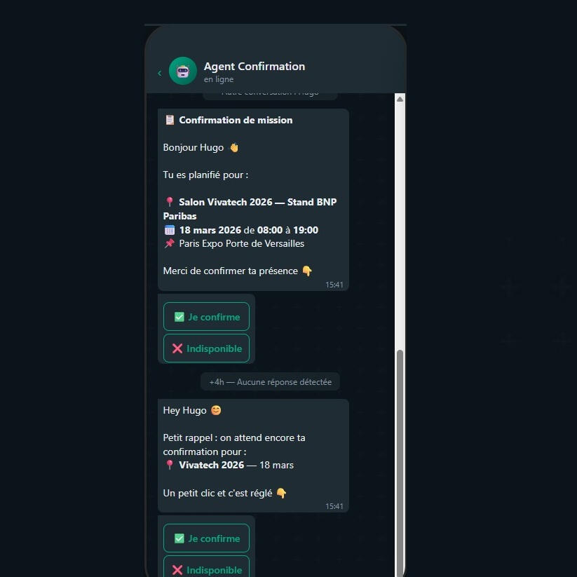 Notre agent gère les confirmations du personnel via WhatsApp, en envoyant automatiquement des relances pour réduire les absences de dernière minute.